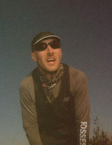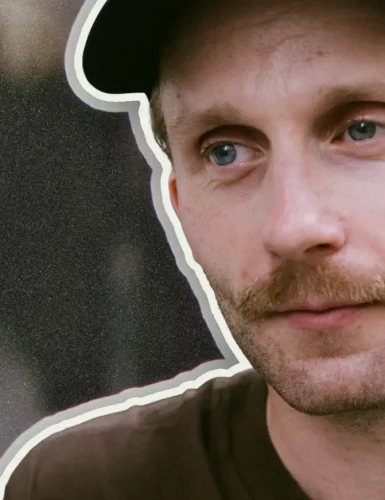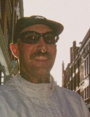 A man standing in front of Portal's Paris Fashion Week release